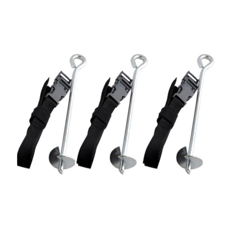 Pour fixer un trampoline 3 pieds au sol. Vrille à visser dans le sol à coté d'un pied de trampoline pour passer une sangle autour du cadre du trampoline et le fixer au sol. Mettre autant de fixation que de pieds du trampoline. Existe aussi en pack pour trampoline 4 pieds (Si plus de pieds, combinez deux pack ou un pack et un fer à l'unité)