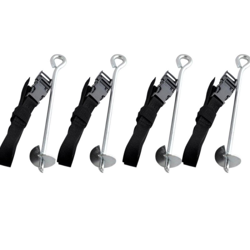 Pour fixer un trampoline 4 pieds au sol. Vrille à visser dans le sol à coté d'un pied de trampoline pour passer une sangle autour du cadre du trampoline et le fixer au sol. Mettre autant de fixation que de pieds du trampoline. Existe aussi en pack pour trampoline 3 pieds (Si plus de pieds, combinez deux pack ou un pack et un fer à l'unité).
