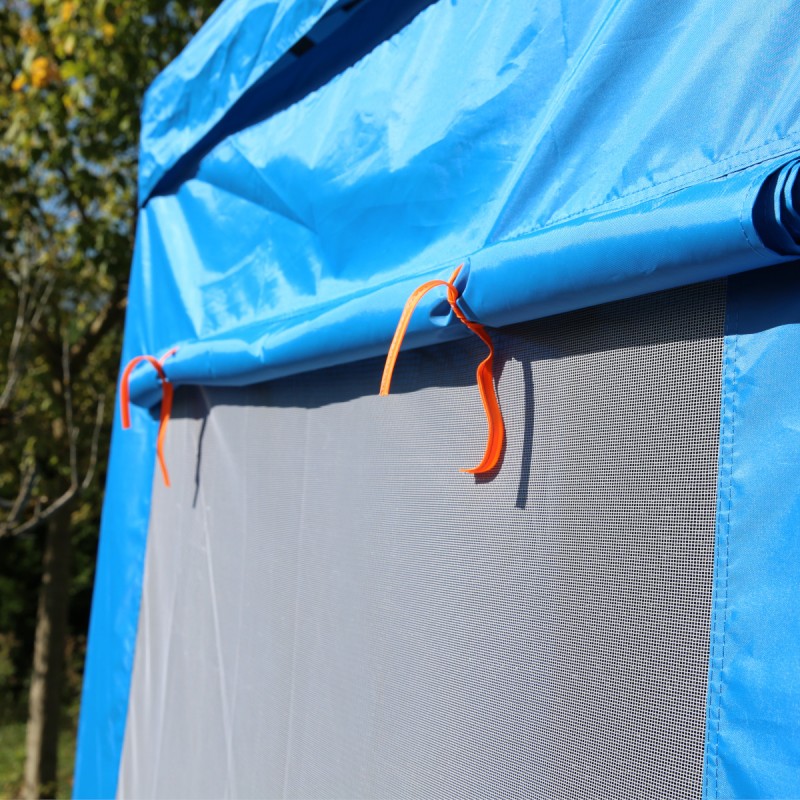 Le montage de la tente cabane pour trampoline est un jeu d'enfant! Les tiges en fibre souples du toit se fixent facilement au sommet du filet de sécurité du trampoline à l'aide de crochets intégrés. Ensuite, les parois de la cabane se fixent simplement aux montants du trampoline à l'aide de sangles et clips, assurant ainsi une installation sécurisée en quelques minutes seulement.