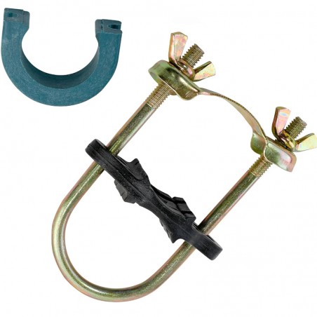 Bride pour fixation de poteau de filet au cadre de trampoline.